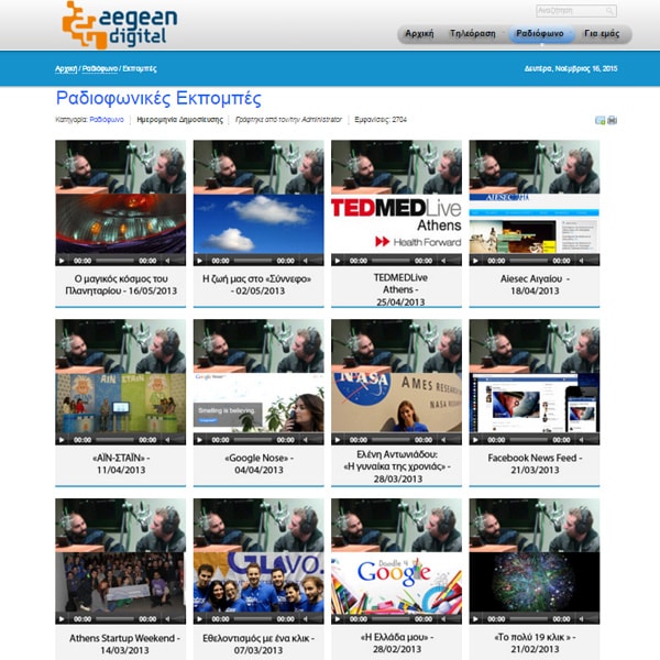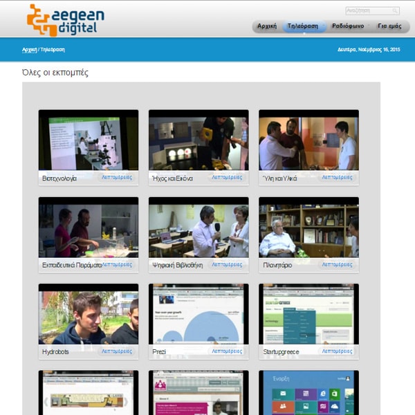 To Aegean Digital είναι μια εβδομαδιαία τηλεοπτική και ραδιοφωνικής εκπομπή τεχνολογίας με ενημερωτικό και εκπαιδευτικό χαρακτήρα. Τα δυο σημαντικότερα στοιχεία πάνω στα οποία στηρίχτηκε το συγκεκριμένο site είναι η δημιουργία ενός διαδραστικού interface που αντανακλά την θεματολογία της εκπομπής Αegean Digital καθώς η επιλογή ταξινόμησης που εξυπηρετεί την παρουσίαση τόσο των video της τηλεοπτικής εκπομπής όσο και ραδιοφωνικής εκπομπής.