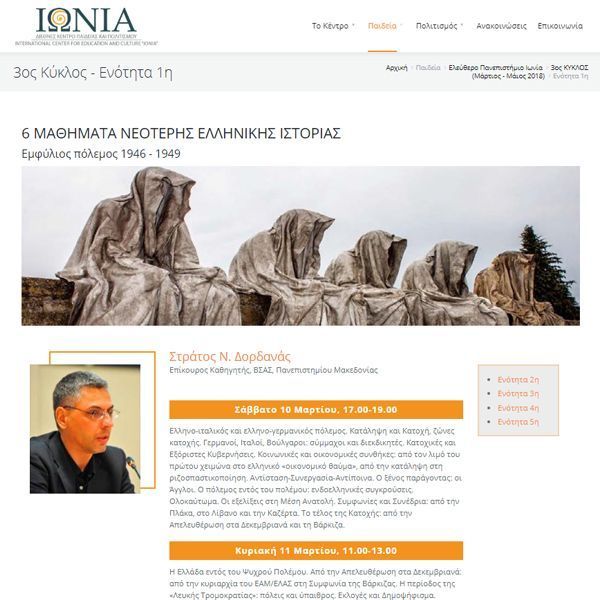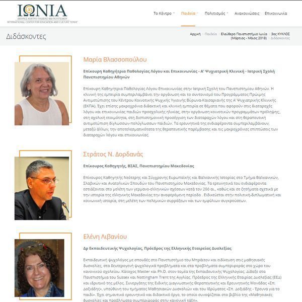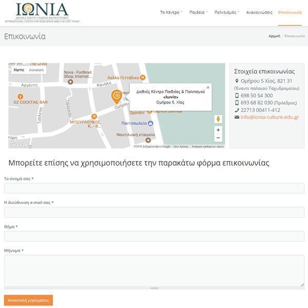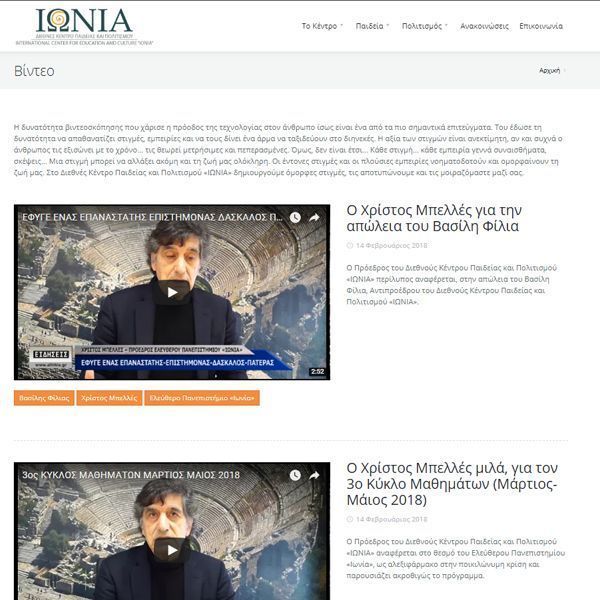 Το Διεθνές Κέντρο Παιδείας και Πολιτισμού «Ιωνία», δημιουργήθηκε με σκοπό να προάγει την εκπαίδευση, τον Πολιτισμό καθώς και θέματα παράδοσης και ιστορίας. Η σχεδιαστική αισθητική του συγκεκριμένου έργου, ακoλούθησε την γενικότερη φιλοσοφία του Κέντρου «Ιωνία», παραμένοντας αφαιρετική με απλές γραμμές και σύγχρονη οπτική. Δόθηκε ιδιαίτερη έμφαση στην απλή και κατανοητή παρουσίαση του προγράμματος του Κέντρο καθώς και των βασικών τομέων δράσεις έτσι ώστε να δημιουργηθεί στην αρχική σελίδα ένας κορμός ξεχωριστών ενοτήτων , οι οποίες και παρουσιάζουν συνολικά το έργο και τις δράσεις του κέντρου. Τέλος, σημαντικό θα ήταν να αναφέρουμε ότι δόθηκε ιδιαίτερη προσοχή στην προβολή υλικού με διαφορετικά μέσα, έτσι ώστε να επιτύχουμε την καλύτερη αξιοποίηση της μεγάλης παραγωγής υλικού πολιτισμού του Διεθνές Κέντρου Πολιτισμού «Ιωνία».
