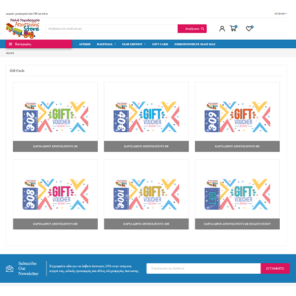 To apostolistoys.gr είναι ένα σύχρονο eshop με πολλές και διαφορετικές κατηγορίες προϊόντων που φιλοδοξεί να προσφέρει μια ευχάριστη και αποτελεσματική εμπειρία αγορών στους χρήστες. Δόθηκε ιδιαίτερη έμφαση στον σύγχρονο σχεδιασμό και στην άμεση επικοινωνία των πελατών με το κατάστημα.
