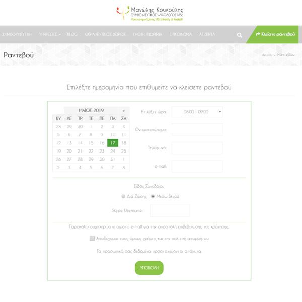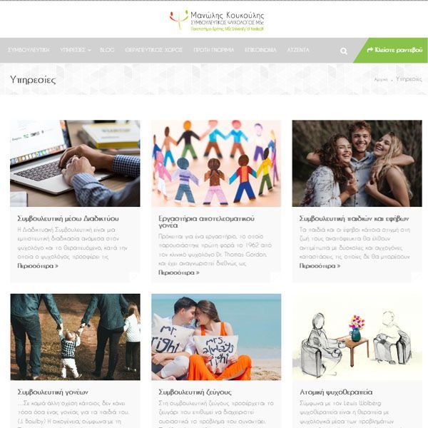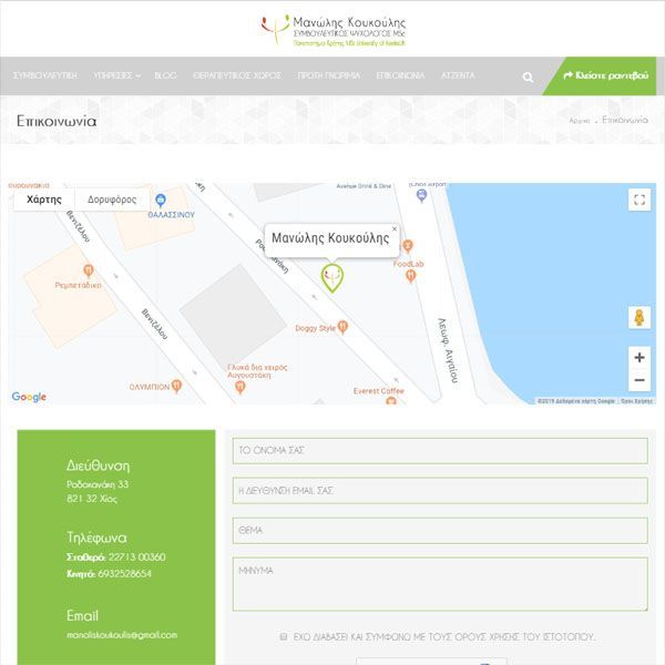 Ο Μανώλης Κουκούλης ψυχολόγος – ψυχοθεραπευτής με έδρα την Χίο εξειδικεύετε στην ατομική συμβουλευτική καθώς και στην συμβουλευτική οικογένειας και ζεύγους. Στο συγκεκριμένο project στόχος μας ήταν να δημιουργήσουμε ένα σύγχρονο φιλικό προς τον χρήστη ιστότοπο με σύγχρονες λειτουργικότητες, αλλά και μια εύκολη και γρήγορη διαδικασία αίτησης ραντεβού με ξεχωριστή την ενότητα skype ραντεβού.