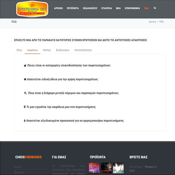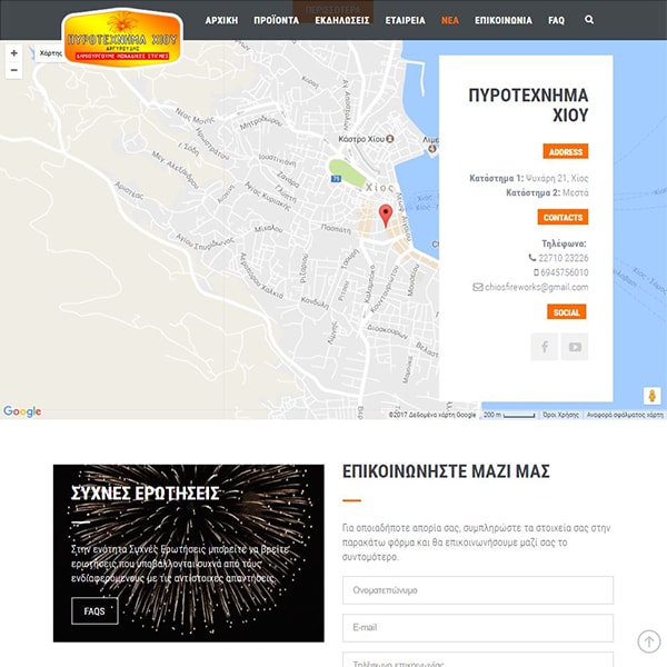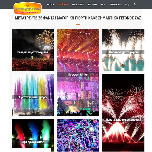 Το Πυροτέχνημα Χίου ιδρύθηκε με σκοπό την κάλυψη κάθε ανάγκης σχετικής με πυροτεχνήματα είτε σε επίπεδο εμπορίου είτε σε επίπεδο εκδηλώσεων. H δημιουργία του εταιρικού site βασίστηκε στην παρουσίαση και προβολή με δυναμικό τρόπο του φωτογραφικού υλικού και με στόχο τo layout του ιστότοπου να παραλληλίζεται με τις κινήσεις και τα χρώματα πυροτεχνημάτων.